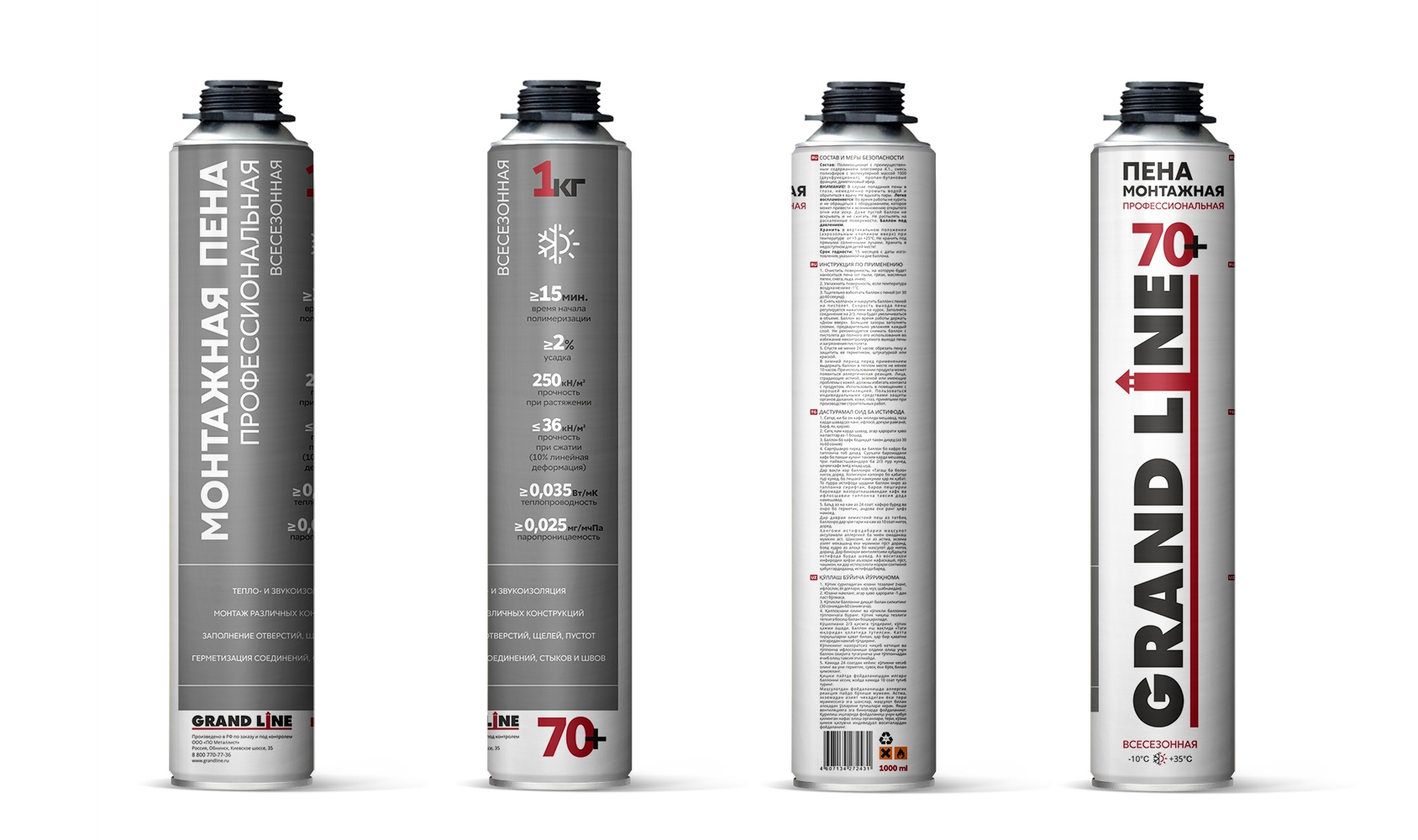Монтажная пена Grand Line 70+ всесезонная имеет специальную формулу, которая обеспечивает повышенный выход пены. Монтажная пена отличается активным первичным расширением, повышенным объёмом выхода пены. Пена обладает хорошей адгезией к большинству строительных материалов, за исключением фторопласта, силикона и полиэтилена. Монтажная пена имеет специальную формулу, которая обеспечивает повышенный выход пены. Применяется для герметизации, тепло – и шумоизоляции швов, щелей, пустот, монтажа деталей при выполнении строительных и отделочных работ.