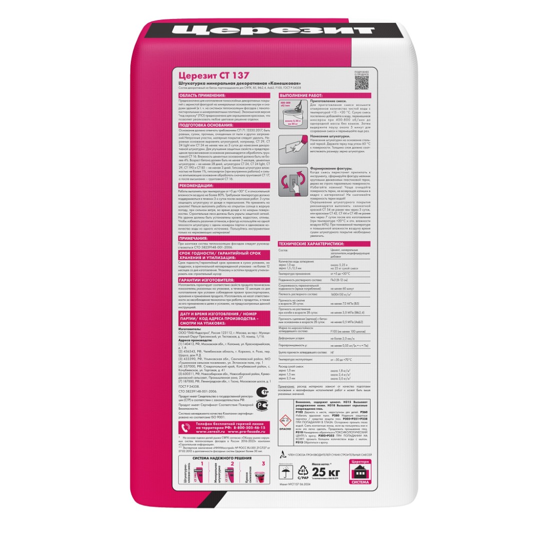 Штукатурка СТ 137/25 кг минеральная "камешковая" 1.5 мм под окраску - влагостойкая и морозостойкая штукатурка на основе цемента, минеральных заполнителей и полимерных модификаторов . Подходит для применения внутри и снаружи зданий. Штукатурка предназначена для выполнения декоративного тонкослойного покрытия на бетонных основаниях, традиционных штукатурках, гипсовых основаниях, плитах ДСП, гипсокартоне и так далее. Может также служить в качестве декоративно-защитного слоя в легких штукатурных системах утепления наружных стен зданий при использовании в качестве утеплителя как минераловатных, так и пенополистирольных плит.