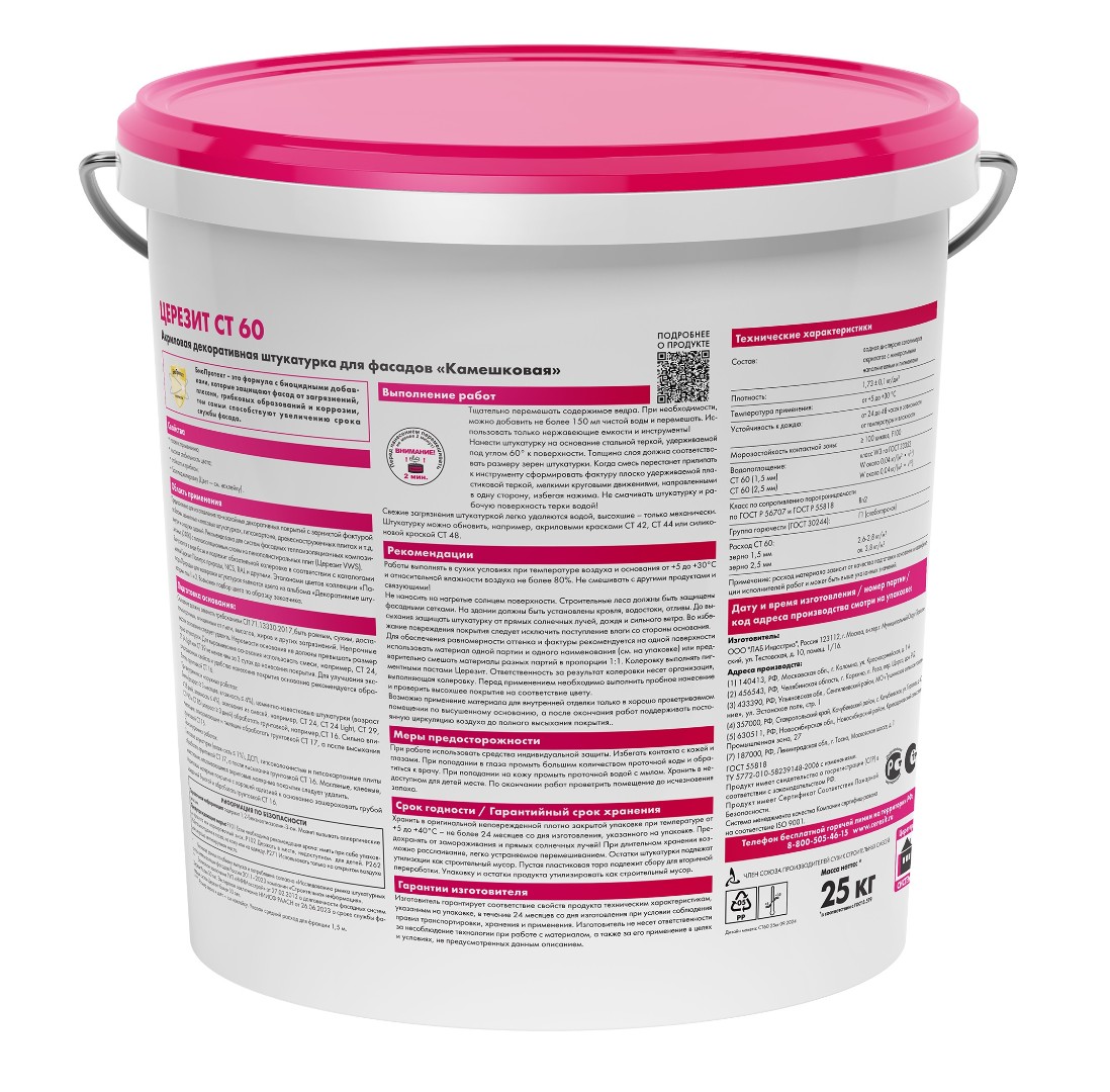 Описание товара: "Штукатурка акриловая Ceresit СТ 60 2,5 мм "камешковая" база (25 кг)"